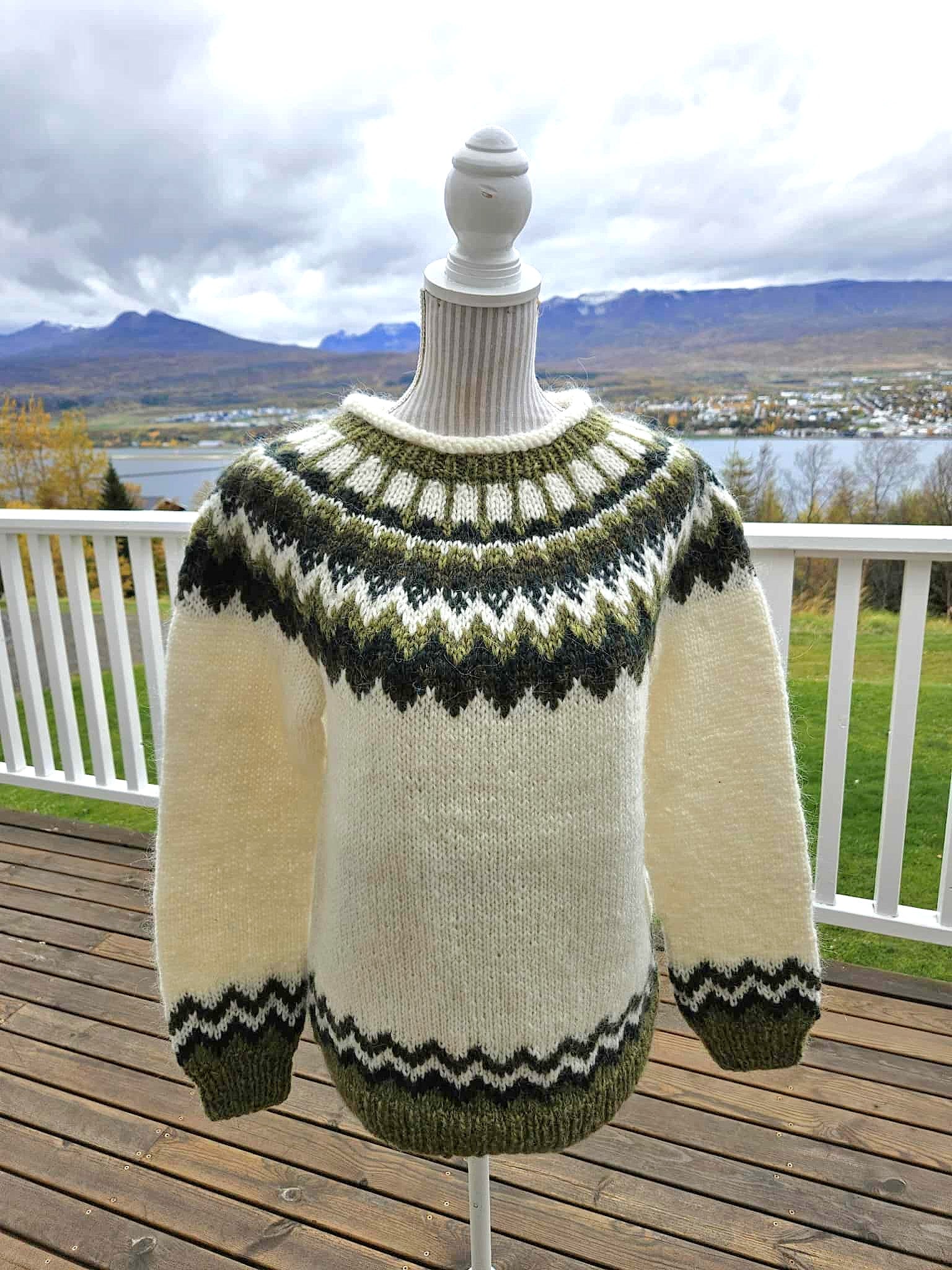 This hand-knit Icelandic wool sweater is made by Guðný Kristinsdóttir in Akureyri (North of Iceland). The pattern is called Oddar or Spikes in English.