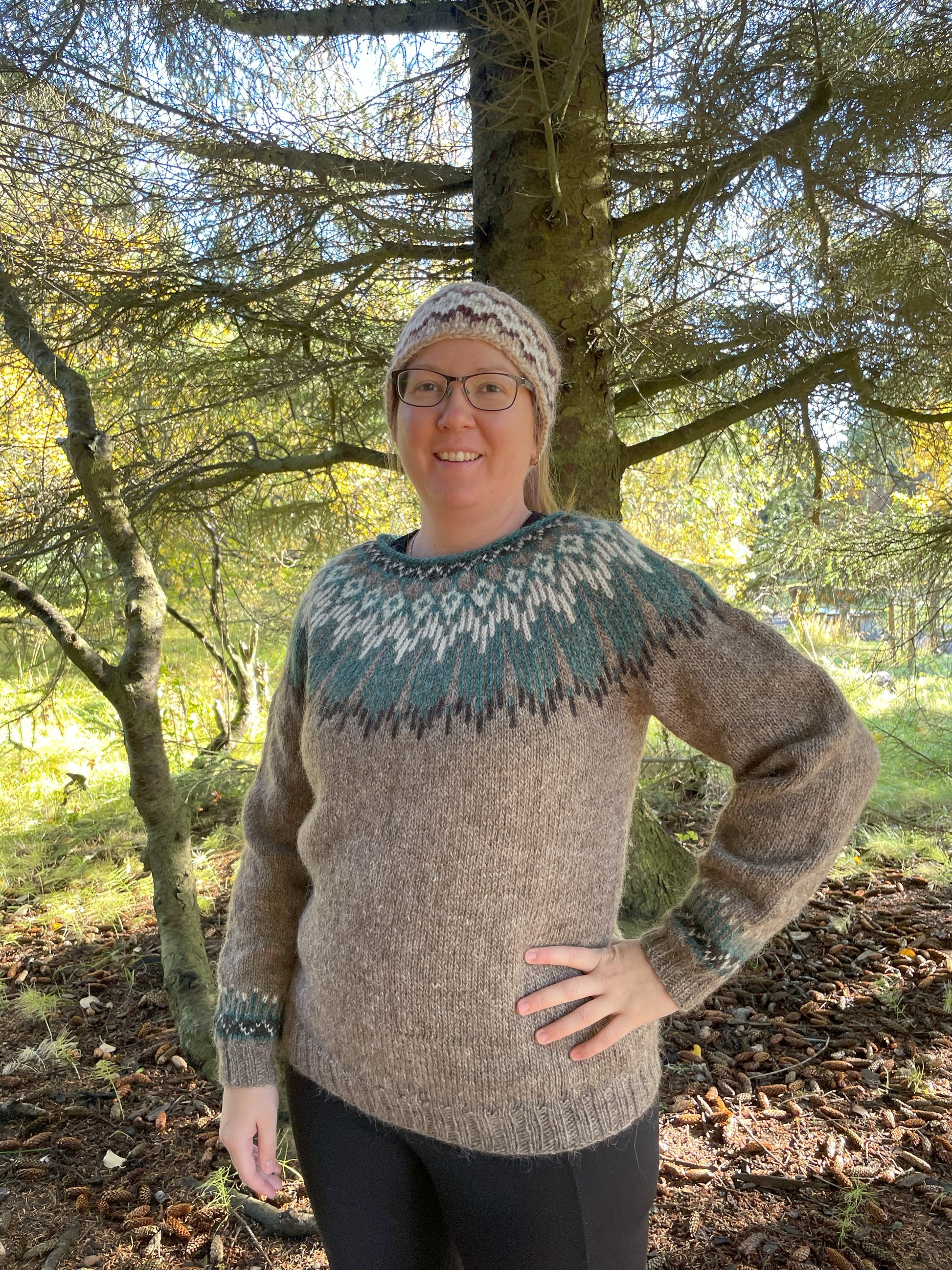 This hand-knit Icelandic wool sweater is made by Hafdís, also known as Anganora in Reykjavík. This pattern is called Hopi.
